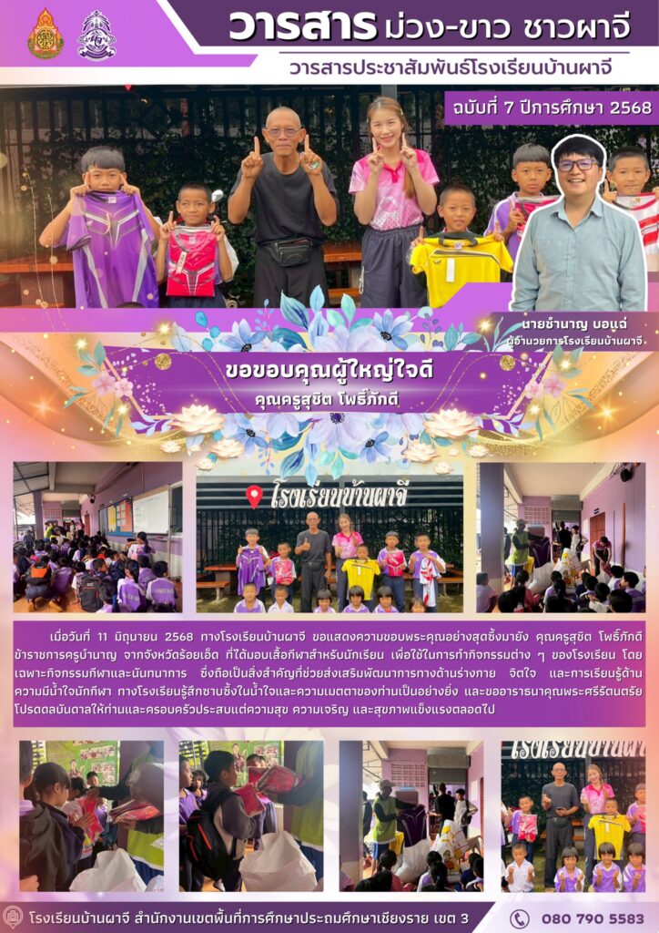 เมื่อวันที่ 11 มิถุนายน 2568 ทางโรงเรียนบ้านผาจี ขอแสดงความขอบพระคุณอย่างสุดซึ้งมายัง คุณครูสุชิต โพธิ์ภักดี ข้าราชการครูบำนาญ จากจังหวัดร้อยเอ็ด ที่ได้มอบเสื้อกีฬาสำหรับนักเรียน เพื่อใช้ในการทำกิจกรรมต่าง ๆ ของโรงเรียน โดยเฉพาะกิจกรรมกีฬาและนันทนาการ ซึ่งถือเป็นสิ่งสำคัญที่ช่วยส่งเสริมพัฒนาการทางด้านร่างกาย จิตใจ และการเรียนรู้ด้านความมีน้ำใจนักกีฬา ทางโรงเรียนรู้สึกซาบซึ้งในน้ำใจและความเมตตาของท่านเป็นอย่างยิ่ง และขออาราธนาคุณพระศรีรัตนตรัยโปรดดลบันดาลให้ท่านและครอบครัวประสบแต่ความสุข ความเจริญ และสุขภาพแข็งแรงตลอดไป